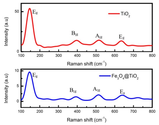 The results of Raman spectroscopy are shown in Figure 2. The peaks of basic vibration modes of anatase TiO2 were 144, 394, 514 and 636 cm−1 [19]. The vibration at 144 cm−1 of the Eg peak was due to the symmetric stretching vibration of the O-Ti-O bond in TiO2, and its intensity decreases with the increase in exposed (001) facets. The A1g peak at 514 cm−1 was generated by the antisymmetric bending vibration of O-Ti-O in TiO2 and its intensity increased with the increase in exposed (001) facets. Therefore, the percentage of exposed (001) facets exposed for TiO2 and Fe3O4@TiO2 can be calculated by measuring the peak intensity ratio of the Eg and A1g modes [20]. The percentages of exposed (001) facets of TiO2 and Fe3O4@TiO2 were estimated to be 12.1% and 25.2%, respectively.