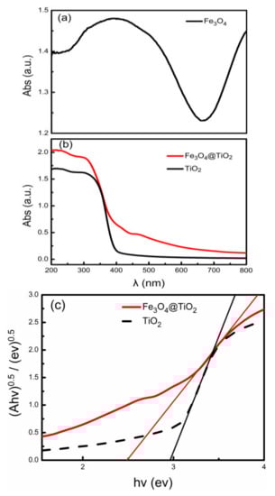 UV-VIS DRS of (a) Fe3O4, (b) TiO2 and Fe3O4@TiO2; (c) Plot of transferred Kubelka−Munk values versus the energy of the light absorbed by TiO2 and Fe3O4@TiO2.