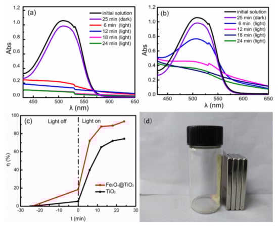 The dark reaction showed that both Fe3O4@TiO2 and TiO2 had good adsorption of AR73, as shown in Figure 6. In the initial stage of photocatalytic reaction, the concentration of AR73 was high, and the rate of dye degradation was not high, but the rate of dye degradation increased rapidly. The intermediate products generated by the degraded AR73 occupied the activity of the photocatalyst and increased as time went on, so the photocatalytic degradation rate was high, but the rate of dye degradation increased slowly, as shown in Figure 6c. After the combination of Fe3O4 and TiO2, the band gap decreased and the exposure ratio of (001) high-energy facets increased, which improved the photocatalytic activity. This result is consistent with Figure 2 and Figure 5c. With the extension of the photocatalytic time, there were too many intermediates generated by AR73, which led to a significant reduction in the contact dimensions between the AR73 and Fe3O4@TiO2, inhibiting the photocatalytic degradation and causing the degradation rate to increase slowly or even not increase. The photocatalytic degradation rates of TiO2 and Fe3O4@TiO2 at 24 min were 74.47% and 93.56%, respectively, which indicated that under the same experimental conditions, the rate of dye degradation by Fe3O4@TiO2 was better than that by TiO2. Fe3O4@TiO2 was recovered by magnetism, as shown in Figure 6d.