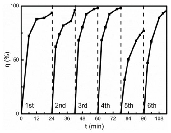 The recovered photocatalyst degraded AR73 under the same experimental conditions. The photocatalytic effect of the recycled photocatalyst is shown in Figure 7. The abscissae 0–24 min, 24–42 min, 42–60 min, 60–78 min, 78–96 min and 96–114 min correspond to the first, second, third, fourth, fifth and sixth photocatalytic reactions, respectively. The result indicates that the rate of photocatalytic degradation of AR73 by the photocatalyst recycled for the fifth time is lower than those of the previous four times, but it can still reach 77.05%, as shown in Figure 7. This phenomenon may be caused by the adsorption of some insoluble or insoluble intermediates on the catalyst surface, which occupies the activity of the photocatalyst, affects the absorbance of the catalyst and reduces the yield of photogenerated electron–hole pairs. Fe3O4@TiO2 in water was irradiated with a high-pressure mercury lamp for 40 min to achieve self-cleaning, and the conditions for self-cleaning were the same as those for photocatalytic degradation of AR73. In the sixth photocatalytic degradation experiment of AR73, the concentration of AR73 was 0.91 mg L−1 and the degradation rate was 95.45% after irradiation for 18 min. This indicated that through self-cleaning, the precipitation on the surface was further degraded by the photocatalyst to soluble small molecules, restoring the photocatalytic activity of Fe3O4@TiO2.