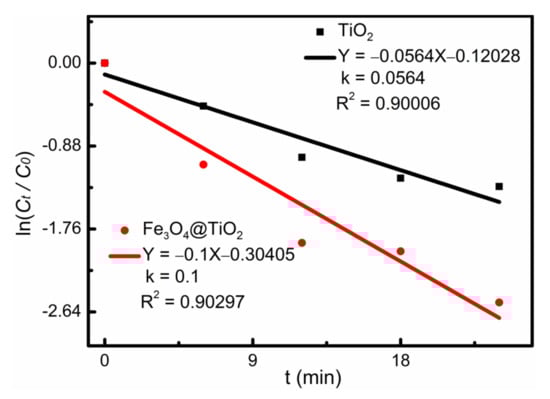 where C0 (mg L−1) and Ct (mg L−1) have the same meaning as in formula (1). The fitting results are shown in Figure 8. It shows that the photocatalytic process has a concentration-controlled reaction rate. The degradation reaction rate constant of Fe3O4@TiO2 was better than that of TiO2. This result is consistent with Figure 6c.