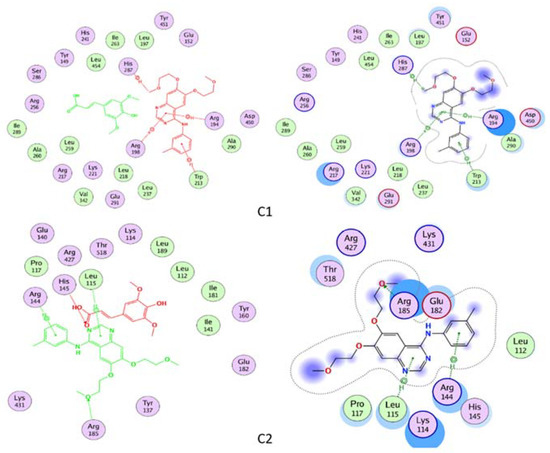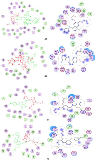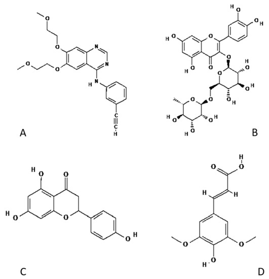 The ETB (Figure 1) is an ATP-competitive quinazoline derivative that works by binding to the epidermal growth factor receptor (EGFR), disabling its phosphorylation ability leading to apoptosis [24]. It is a tyrosine kinase inhibitor used to treat non-small-cell lung cancer (NSCLC). In 2013, ETB was approved by FDA for use as a first-line treatment of NSCLC in patients whose tumors harbor EGFR exon-19 in-frame deletions or exon-21 (L858R) mutations. (20-b) [25]. Coadministering RTN, NAR, and SIN either as dietary supplements or as their presence in fruits or vegetables and ETB to treat NSCLC might cause some interactions, resulting in altered therapeutic benefit or higher incidence of adverse events to ETB [24,26].