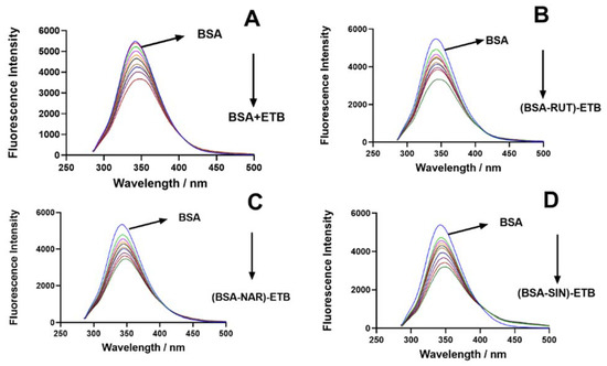The BSA-ETB spectra were also recorded for each RUT, NAR, and SIN to observe if any difference in the spectra of BSA occurs in the presence of these flavonoids (Figure 5B–D). The BSA showed hyperchromicity on interaction with ETB in the presence of RUT, NAR, and SIN. The spectra for the ternary system of BSA-ETB were significantly different from those of the BSA-ETB spectra binary system. Hence, the binary and the ternary-system complexes formed were completely different from one another. Further comparing the ternary systems amongst themselves, the spectra differed from each other and thus inferred that complexes formed between BSA-ETB in the presence of RUT, NAR, and SIN were also different.
