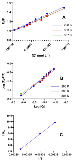 The Stern Volmer plot of the BSA-ETB system showed declined quenching constant Ksv values with the elevated temperature (Table 1). The Stern Volmer plots at the three studied temperatures were linear (Figure 3A). In static or dynamic quenching, Ksv decreases or increases, respectively, with a temperature rise. Since the BSA-ETB system showed reduced Ksv values with increased temperature, the BSA-ETB system followed a static-quenching mechanism [31,32]. Further, the static quenching also suggests the formation of a stable complex between the two of them. The biomolecular quenching constant values provide a tool to establish the quenching mechanism. The static-quenching behavior of the BSA-ETB complex for the binary system is predicted based on the biomolecular quenching constant values that were higher than 2 × 1010 L mol−1 s−1 (Table 1). It is already well-known that kq values more than the 2 × 1010 L mol−1 s−1 suggest a static quenching, whereas the values below indicate a dynamic quenching between binary systems [31,32].