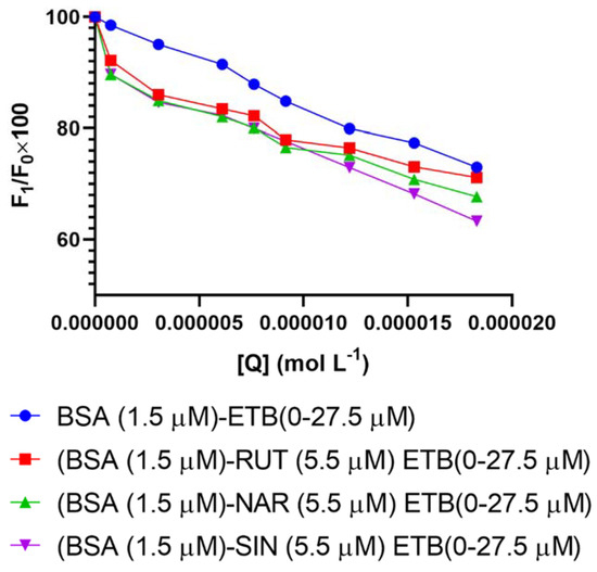 The binding constants were compared to each other for both the ternary and binary systems. A decrease in the binding constants was observed with a temperature rise in the binary system compared to the ternary system. It was observed that the addition of the flavonoids in the BSA-ETB system interfered in the binding and quenching constants of the BSA-ETB system (Table 2). The interaction with flavonoids (RUT, NAR, and SIN) and BSA was previously reported to decrease albumin fluorescence, and the binding constants for the three flavonoids RUT, NAR, and SIN were of the magnitude of >106, >104, and >105, respectively [34,35,36,37]. The presence of RUT, NAR, and SIN increased the quenching constants in the ternary system. In the binary system, ETB quenched the fluorescence of the serum albumin by 27%, while as in the ternary system, RUT, NAR, and SIN in the ETB quenched the fluorescence of serum albumin by 29%, 33%, and 37%, respectively (Figure 4). Therefore, the influence of the studied flavonoids varied, with RUT affecting the least followed by NAR and the highest with SIN. The elevated quenching constants for the ternary system suggest that RUT, NAR, and SIN might have increased the accessibility of the ETB to the BSA, improving its quenching efficiency or the flavonoids had a synergistic effect. Hence, the quenching increased (Table 2) [38].
