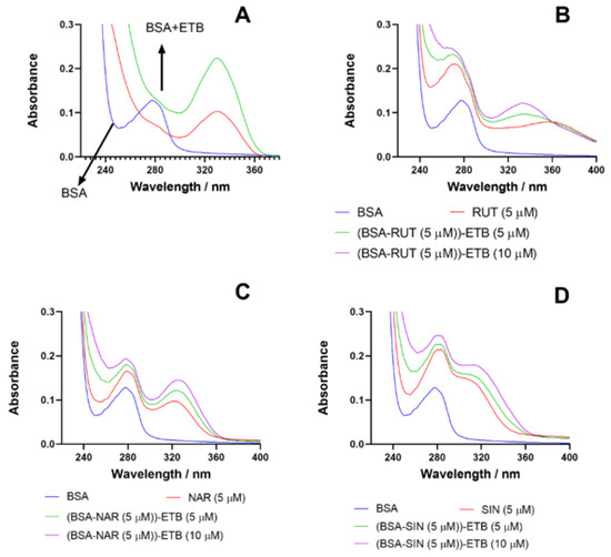 Ultraviolet-visible spectra for (A): BSA (1.5 μM) in presence and absence of ETB (0.00–10 μM) and in presence of (B): RUT; (C): NAR; (D): SIN.