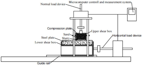 The compression plate (diameter 87 mm, height 5 mm) was placed in the upper shear box (outer diameter 98 mm, inner diameter 88 mm, height 100 mm), and then sand was used to fill the shear box. The sand was compacted to a filling height of 85 mm, and finally, the configurated slurry was used to fill the shear box and scraped with a scraper. When the friction characteristics of the interface between the steel plate and sand were tested, it was only necessary to fill the shear box with sand and compact it.