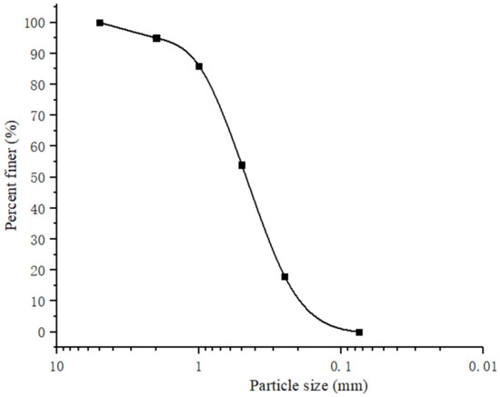 The sand, steel plate, and slurry-making materials used in the indoor test were consistent with those used on site. The size of the steel plate was 350 mm × 250 mm × 20 mm. The slurry-making material used was the special compound bentonite from Trenchless (mainly composed of sodium bentonite and sodium carboxymethyl cellulose). The natural density of sand is 1.73 g/cm3, the dry density is 1.60 g/cm3, the natural moisture content is 8.1%, the internal friction angle is 35.5°, and the cohesion is 1.5 kPa. The particle size distribution is shown in Figure 4.