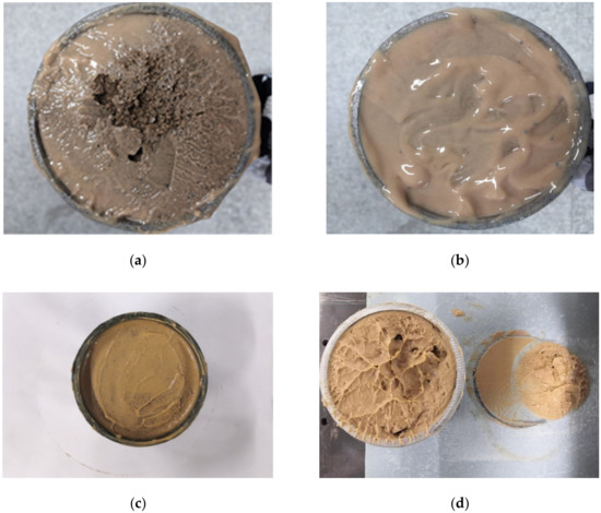 Table 2 shows that the peak shear stress and friction coefficient increased with the increase in the concentration, which is greater than 20%. This is occurred because the slurry with a concentration greater than 20% was semi-solid, its “support-barrier” soil effect was remarkable, and the adhesion degree with the pipe wall was greatly improved. When the sand slid relative to the pipe wall, shear failure occurred in the slurry interior (as shown in Figure 6d). Therefore, when the pipe soil slid relatively, it had to overcome the spatial structure strength of the slurry, which is the gel strength. With the further development of shear, the relative sliding of the pipe soil was subjected to the cohesion of particles in the slurry, which is internal friction. As the gel strength (or static shear stress) of the slurry increased with the increase in the solid particle content, and the internal friction increased with the increase in the solid particle content, the greater the slurry concentration, the greater the peak shear stress and friction coefficient.