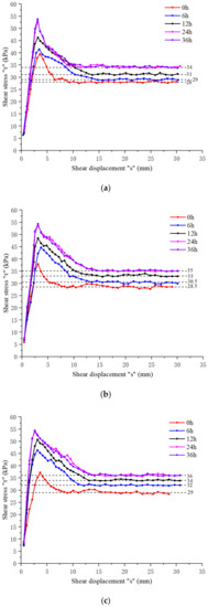 As shown in Figure 7, the standing time had little effect on the “τ–s” curve of the interface, and the curve was still the strain softening type. Under the same concentration condition, the “τ–s” curve of the interface of the slurry standing times of 24 and 36 h approximately coincided. According to the data shown in Table 3, under the same concentration, the peak shear stress and friction coefficient increased first and then stabilized with the increase in the slurry standing time.
