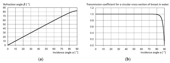 In the case of transmission of ultrasound waves through the soft tissue structure of a female breast immersed in water, the refraction phenomenon will occur due to the differential velocity of ultrasound in water and the breast and due to the inhomogeneity of the breast structure. It can be estimated that the refraction of the ultrasound beam at the water/breast interface will not be significant due to the near unity index of refraction n, defined as the ratio of ultrasound velocity in water to ultrasound velocity in the structure [22]. Figure 1a shows the dependence of the refraction angle of the ultrasonic wave at the straight-line interface of the water/breast on the angle of incidence, calculated from the Snellius law. Figure 1b shows the dependence of the amplitude pressure coefficient of the transmission of the ultrasonic wave through a circular breast section immersed in water, calculated sequentially for the water/breast/water boundaries using the formula: