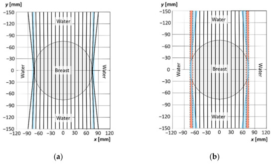 To illustrate refractive errors in the ultrasound transmission tomography scanning process of breast tissue, numerical calculations were performed for a homogeneous circular cylinder section simulating a coronal cross-section of a 150 mm diameter female breast with an assumed average ultrasound velocity for a premenopausal woman cbreast = 1510 m/s (T = 37 °C) [40,41], immersed in water at temperature T = 25 °C (cwater ≈ 1496.7 m/s) and T = 37 ° C (cwater ≈ 1523.7 m/s), respectively. The distance between the transmitter and the receiver in water was set as lo = 300 mm.