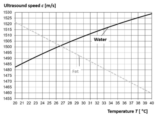 The most important acoustic parameter affecting the refraction of ultrasound wave beam rays is its propagation velocity in the medium, especially its changes as a result of inhomogeneity or layering of the tested medium. The weakening of the energy of the ultrasound wave after its passage through the medium is also important, as it depends mainly on the ultrasound attenuation coefficient and the wave transmission coefficient (Figure 1b) through the layers of different acoustic impedances (the product of the ultrasound velocity and the density of the medium). The ultrasound velocity is temperature dependent and increases with increasing temperature in most soft tissues and in water. In fat, the ultrasound velocity decreases with increasing temperature. The average value of the propagation velocity of the longitudinal ultrasound wave in soft tissues is assumed to be c = 1540 m/s (density ρ = 1058 kg/m3, acoustic impedance Z = 1.62∙106 kg/(m2∙s)), and the mean value of the attenuation coefficient of the amplitude of the ultrasound wave is α = 0.5 (dB/cm)/MHz ≈ 5.8 (Np/m)/MHz [40]. With some approximation, it can be assumed that in the frequency range of 1–6 MHz, the ultrasound attenuation coefficient α/f in soft tissues is constant. Increasing the water or fat content in the tissue generally decreases the ultrasound velocity value. For soft tissues not containing fat, the average values of acoustic parameters are respectively: c = 1575 m/s, α = 0.3 (dB/cm)/MHz ≈ 3.5 (Np/m)/MHz, while for tissues containing fat: c = 1465 m/s, α = 0.6 (dB/cm)/MHz ≈ 6.9 (Np/m)/MHz [45]. The ultrasound velocity in water is, respectively: 1496.7 m/s for 25 °C, 1509.2 m/s for 30 °C, and 1522.9 m/s for 36.6 °C [40]. Based on data from the literature, ultrasound velocity in breast adipose tissue (fat layer under the skin) is 1470 m/s in vivo (at body temperature T = 36.6 °C). The temperature coefficient of breast fat in the temperature range 22–37 °C is dc/dT = −3.1 (m/s)/°C. The temperature dependence of the ultrasound velocity in water and fat is illustrated as a graph in Figure 6.