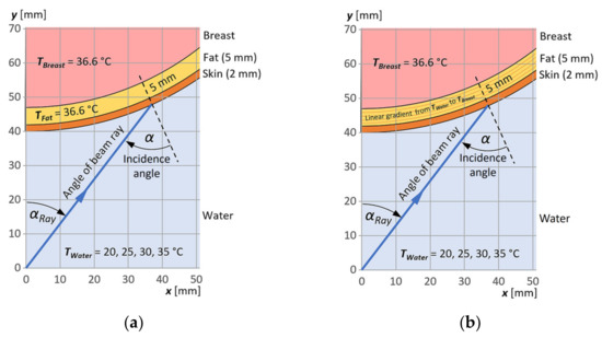 Layered computational models of the water/skin/breast fat/breast glandular tissue media: (a) assuming body temperature in the breast fat layer; (b) assuming a linear temperature gradient changing from water temperature to body temperature in the breast fat layer.