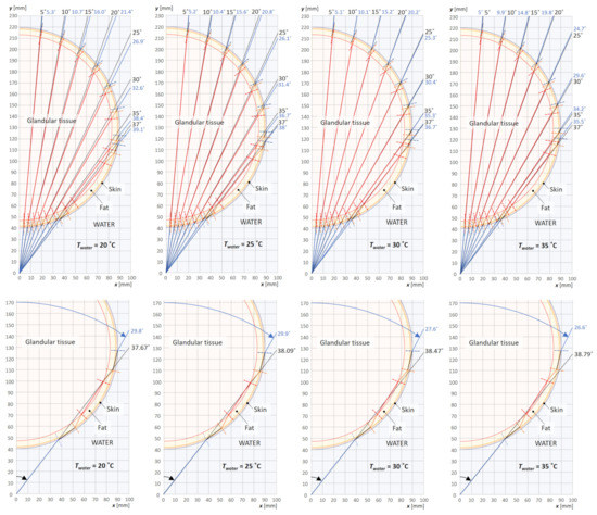 When analyzing individual cases for beam ray angles in the range of 5° to 37° shown in Figure 9 and Figure 10 (top rows), it can be observed that as the water temperature increases to 30 °C, the refraction phenomenon at individual layer boundaries proceeds with decreasing intensity. The minimization of refraction results in a correct (close to rectilinear) course of the ultrasonic wave beam ray through the layers. Furthermore, the refracted rays coming out of the breast section have larger Y-axis deviation angles compared to the incident rays. For a water temperature of 35 °C, the refraction phenomenon is still low, but the outgoing rays have smaller angles of deviation from the Y-axis compared to the incident rays. This means that in the angular range of 0–37° we can find the optimum value of the water temperature (between 30 °C and 35 °C) due to the refraction minimization. For beam ray angles close to the critical incidence angles at the breast cross-section boundary (see the second row in Figure 9 and Figure 10), the refraction phenomenon successively increases intensity with increasing water temperature from 20 °C to 35 °C. Moreover, in this case, the refraction angles especially at the water/skin and fat/skin boundaries increase significantly, and deviation of the ray path from straightness are large. This is also associated with an elongation of the transition paths through these layers, resulting in a weakening of the ultrasonic signal.