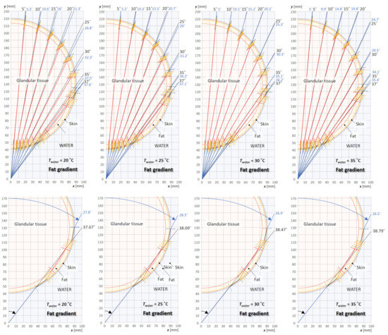 Results of calculating the refraction of the incident ultrasonic wave beam rays from water on curvilinear breast layers without temperature gradient in fat (see the model in Figure 8a) for angles of beam rays in the range of respectively of 5–37° (first row), as well as for the maximum possible values of the angle of beam ray still allowing this ray to pass through all layers (second row), for temperatures of 20 °C, 25 °C, 30 °C, and 35 °C (rows).