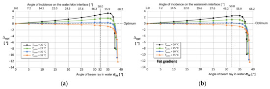 where —angle of deviation from the Y-axis of the beam ray incident from the water on the boundary of the breast skin layer, —angle of deviation from the Y-axis of the beam ray exiting the breast skin layer into the water. The optimal value of ∆opt = 0 means that the beam ray incident from the water on the breast skin has the same directional coefficient as the beam ray that exits from this section into the water. Figure 11 shows the results of the calculation of the parameter ∆opt as a function of the angle , for different values of the water temperature and both models (without and with a temperature gradient in the fat layer). On the auxiliary X-axis, the values of incidence angles of the beam rays at the water/skin boundary determined from angles are given.