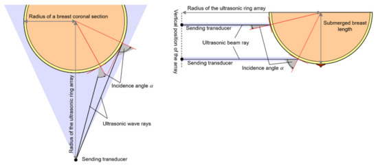 However, it should be noted that the reciprocal relationship between the inside diameter of the ring array and the diameter of the breast cross-section and the number of ultrasonic transducers are important in modeling. The angles of incidence of ultrasound beam rays in the cross-sectional area of the breast in the horizontal plane can approach 90° for the divergence angles of the beam that cover this cross-section (Figure 13), and the divergence angles decrease with the Db/Dr ratio. In the vertical plane, because the beam is narrow and the array moves along the breast hanging in water, the planes of the breast sections examined are parallel to each other and critical incidence angles above 60–70° are obtained only for sections of the breast tip, near the nipple (Figure 13). However, the phenomenon of vertical ray refraction (even small) is much more dangerous than horizontally, because in this case the rays of a narrow beam, after refraction, may not reach the surface of the receiving transducer on the other side. Thus, it may be impossible to examine the breast tip over a fairly large range of cross-sections because of vertical refraction.