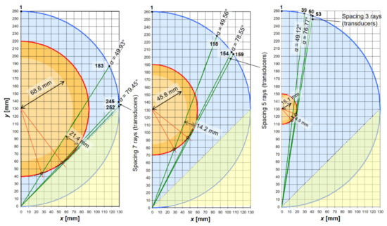 The results of the model calculations of the area of the largest refraction of the ultrasound wave in the cross-section of a breast immersed in water, inside the ring array for three different diameters of these breast cross-sections (Db = 180, 120, 40 mm) are presented in the horizontal plane in Figure 14 and in the vertical plane in Figure 15 (transducer No. 513 is the source). For the assumed value of the inner diameter of the ring array Dr = 260 mm and when using 513 receiving transducers in 1 measurement projection, the maximum diameter of the measured breast cross-section Db cannot exceed ~180 mm.