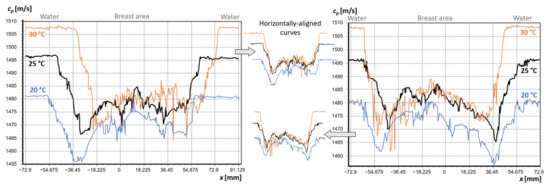 Figure 16 shows ultrasound tomography projection velocity values (see Figure 3b) measured for the breast of the Patient 1 in water at 20 °C, 25 °C, and 30 °C, presented in parallel ray scanning geometry for a selected rotation angle (part of a sinogram) [22], for the first and third coronal cross-section from the breast base, respectively.