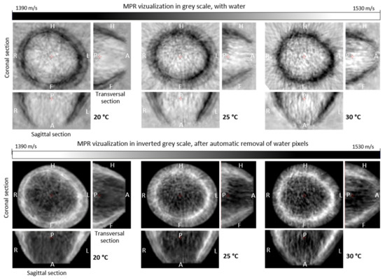 The cp values of the ultrasound projection velocity were determined as the ratio of the rectilinear path of the wave transition between successive pairs of transmitters and receivers to the measured transition time. Figure 17 shows quantitative ultrasound tomography images of the examined breast (Patient 1) in 3 mutually perpendicular sections (MPR) for water temperatures of 20 °C, 25 °C, and 30 °C, respectively, reconstructed based on ultrasound wave transit time data collected around the entire breast. In the images visualized in conventional gray scale (values increasing from black to white), the water pixels around the breast were left, and in the images visualized in inverse gray scale were removed automatically using a specially developed algorithm. The water segmentation is performed radially. The algorithm determines, for a given angle, two points at the water-breast and breast-water boundaries. The resulting polygon is blurred and then a mask is generated for the given cross-section. Water statistics of the ultrasound attenuation are used to detect breast boundaries. The algorithm runs automatically and is robust to noise due to the averaging procedures used. The segmentation algorithm does not introduce changes in the structure of the breast image. It is used to automatically detect the boundaries of a breast immersed in water and mask the water pixels.