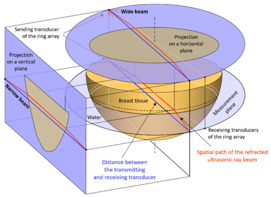 Based on the calculations and measurements performed, it was found that in the ultrasound transmission tomography breast scanning procedure for the incidence angles of ultrasound wave beam rays at the water/breast border greater than about 50°, rays are increasingly refracted, resulting in the formation of a “ring of distortions” in the reconstructed breast cross-sectional image with distortions increasing in the direction of the cross-sectional border. The thickness of this ring decreases with the ratio of the breast diameter to the diameter of the measurement area. Of course, glandular tissue is not homogeneous and, in addition to the distortion associated with refractions at the cross-sectional boundary of the breast around, which will always occur, distortions associated with heterogeneity of the inner breast tissue may appear in different areas of the image (see Figure 4). Refractions can be particularly detrimental in the vertical plane due to the narrow beam of the ultrasound wave, for which diverging rays may not find their way from the transmitter to the receiver after refraction, due to negligible energy. This phenomenon is explained illustratively in Figure 18, which shows the spatial path of a refracted ultrasound wave beam ray through water and breast tissue from the selected sending transducer to the receiving one of ring array for the selected horizontal measurement plane, and the orthogonal projections of this path in the horizontal and vertical planes.