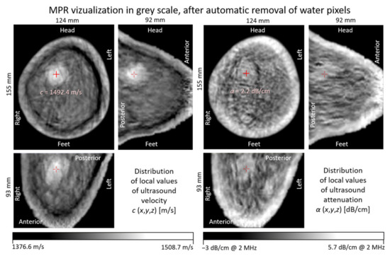 For the reconstruction of quantitative transmission images of ultrasound velocity distribution (UTTc) on ultrasound tomography scanner, the transform-based filtered back projection method (FBP) [45], appropriately adapted to introduce projection sets of ultrasound propagation velocity and attenuation values, was used. From individual 2D images (so-called slices), 2D images in orthogonal cross-sections MPR (Multiplanar Reconstruction) [48], and 3D images using the MIP (Maximum Intensity Projection) tomographic technique [49] were also reconstructed.
