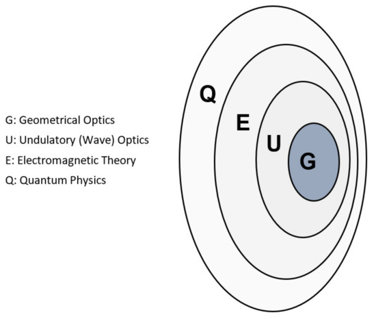 During the running wheel of history, several theories have been used to model the behavior of light, with respect to obstacles [1,2,3]. First, geometrical optics was used to analyze the behavior of light. Light is seen as rays traveling in straight lines [2]. Geometrical optics is the least rigorous theory modeling the behavior of light (Figure 1). Wave optics, or undulatory optics, is a more rigorous theory (Figure 1) [4]. This theory considers light as a propagating wave. It allows us to give an interpretation of the interference phenomenon [5,6]. The scalar theory of diffraction is more rigorous (Figure 1) [7,8,9]. It allows us to handle diffraction and the effects of the boundaries. The electromagnetic theory is more rigorous (Figure 1) [7,10]. Propagation is seen as interaction between the interaction of the electric and magnetic fields in the medium as vector, and not scalar, entities. Quantum physics is more rigorous (Figure 1) [11].