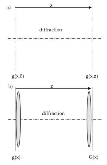 For brevity of notation, we will consider only one lateral dimension, x. Extension to (x,y) analysis is straightforward. The diffraction field g(x,z), seen at a distance, z (Figure 2a), is described by the Fresnel transform [7,23]: