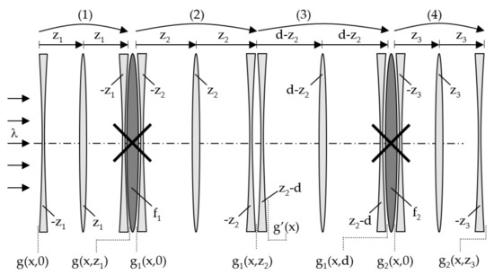 By using the model indicated in Figure 3a, Fresnel diffraction is performed in four steps. This leads to the setup of Figure 5. While the initial (original) lenses of Figure 4 are presented in dark gray color in Figure 5, the lenses of the lenses-based model are presented in light gray color. In step 1, two divergent lenses (in light gray), with focal length –z1, as well as a convergent spherical lens, with focal length z1, are involved in the diffraction process. These three lenses implement the Fresnel transform of g(x,0), at distance z1, means g(x,z1) = FRz1{g(x,0)}, according to the scheme of Figure 3a. Then, light goes through the first original lens (dark gray), with focal length f1. Step 2 puts three lenses into play, which physically implement the Fresnel transform of g1(x,0), at distance z2 and means g1(x,z2) = FRz2{g1(x,0)}, according to the scheme of Figure 3a. Just behind the first initial lens (dark gray), we find the first divergent lens (light gray). Three side-by-side lenses are shown on the left-hand side of Figure 5. The three lenses cancel each other if: