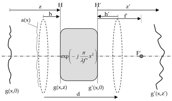 In addition, our approach covers aberrations elegantly. Let us take the case where the first lens is affected by optical aberrations (Figure 6). Our approach remains the same. The wavefront aberration w(x) is included in the analysis. The diffraction field g(x,z) will be calculated in three steps: the Fresnel transform for z-h, a multiplication by a (x), and the Fresnel transform for h (Figure 6). The field a(x) is expressed as a function of w(x):
