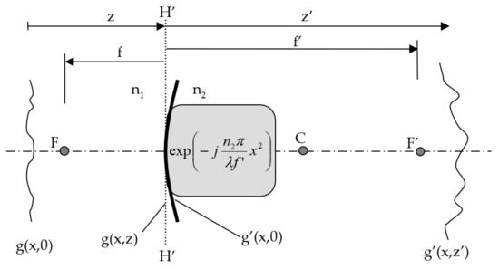 If the incident wave is spherical and originates from the focal point F, as depicted in Figure 7, then we expect a plane wave, which is an image at infinity. In our diffraction-based approach, the field g(x,z) in medium n1 is expressed by: . In medium n2, g’(x,0) is obtained by multiplying this exponential complex term by the transmittance of the system, therefore, resulting in: g’(x,0) = .