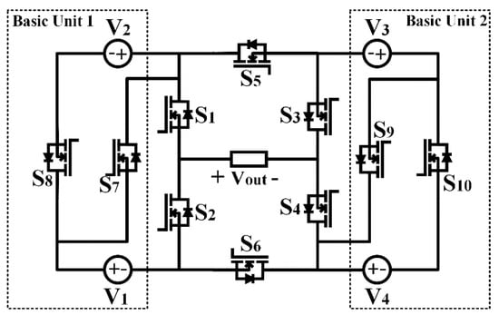 The MLI topology from [13] was chosen in the proposed system, as stated in Section 1. The topology’s structure is shown in Figure 1. The packed H-Bridge unit was the central part of the topology, which consisted of six switches (S1, S2, S3, S4, S5, and S6). The basic units were located on the bridge’s right and left sides. On one side, the basic unit was positioned in the opposite direction to the basic unit on the other side. Each basic unit contained two DC sources (V1/2 and V3/4) and two unidirectional switches (S7/8 and S9/10).