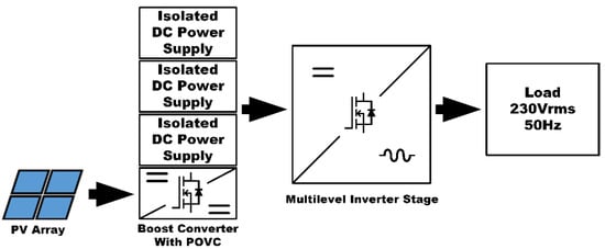 The suggested PV renewable energy system had three primary stages, which were the PV module stage, DC-DC converter stage, and inverter stage. The inverter’s output was directly linked to AC loads for standalone operation. The output rating of the inverter was set at 230 Vrms, 50 Hz. Figure 2 depicts the overview of the entire proposed system. The boost converter was only connected to one MLI input, while the other three inputs were powered by three independent DC power sources since the selected topology shown in Figure 1 had four isolated DC inputs; this was due to a scarcity of resources. For theoretical validation, this arrangement was fairly adequate since a similar concept would apply if the other sources were to be PV powered as well. The actual PV array was connected as the input to the boost converter, and POVC was deployed as the controller.