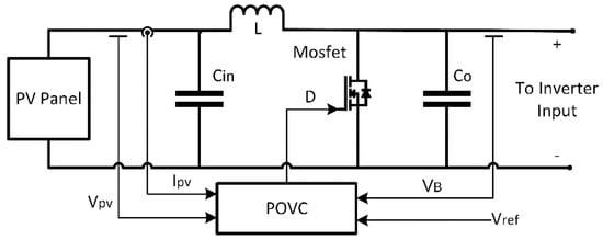 The POVC feedback controller was implemented to control the output voltage of the boost converter. The number of PV panels was selected based on the required power to be delivered by that particular source, based on Equations (10)–(13). A closer view of the implemented boost converter stage with POVC is illustrated in Figure 3.