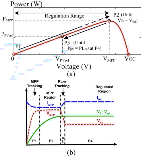 Referring to Figure 4, VPV is the PV voltage that determines the range of VB in (16). In the POVC operation, its minimum and maximum value were 0 and VMPP, respectively. It is best to note that VMPP values vary based on solar irradiance and temperature. Thus, the range of VB in (16) is not fixed. A lower range could be expected at lower solar irradiances and vice versa. Based on (16), the range of VB was also affected by the duty cycle. An example of the voltage regulating range calculation is given in the Results. Figure 5 depicts the POVC regulating range and PLref tracking operation. First, the POVC operated as a standard P&O MPPT algorithm to track for PMPP (P1) and continued operating at MPP (P2) until the boost converter voltage, VB, equalled Vref. As VDC was no longer increasing and fixed at a constant value, the POVC would then track PLref (P3). Thus, the PV power should be maintained (by increasing PV current) to keep the PV operation at PLref (P4).