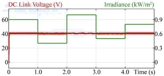 To begin, independent POVC tests were performed without the boost converters connected to the MLI. One module of the PV panel with the specifications listed in Table 3 was linked to a single boost converter with a switching frequency of 20 kHz in the simulation. The temperature was maintained at a constant of 31 °C. With a fixed Vref of 40.66 V and a load of 58 Ω, the POVC was first evaluated for its reaction to rapid variations in irradiance; Figure 8 depicts the outcome. The value of 40.66 V was chosen since it is the value for VDC, which will be addressed further in the upcoming section. The POVC successfully maintained the desired output voltage at all times, as shown in Figure 8.