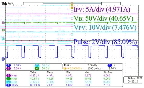 In terms of the voltage regulating range, as briefly described in Section 3.1, the voltage regulating range of the boost converter was not fixed and was directly affected by the solar irradiance and temperature. For instance, using the PV panel given in Table 3, at the irradiance of 800 W/m2 and temperature of 31 °C, the theoretical maximum VB was 262.12 V if the maximum D was set at 0.9, according to (16). If the maximum allowable value of D was limited to 0.6, the maximum boost converter voltage was only 67.03 V. Differently; the theoretical minimum boost converter voltage would always be 0, regardless of environmental conditions.