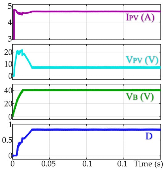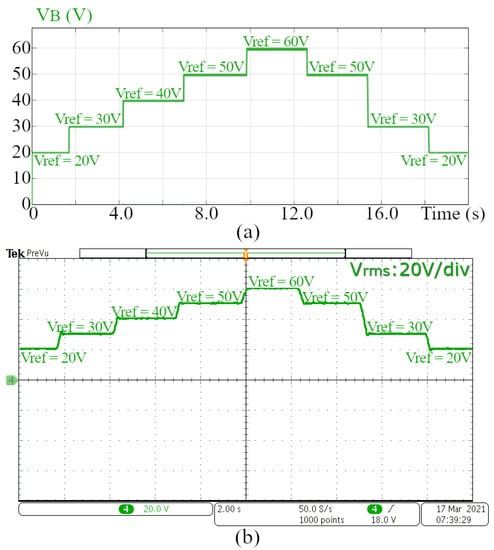 In the experimental analysis, since the actual PV module was used, it was impossible to adjust the irradiance and temperature manually, as in the simulation. Therefore, the POVC was tested at several different times of the day. At the irradiance of 838 W/m2, temperature of 32 °C, and load of 58 Ω, the experimental results for voltage regulation, including all the measured values, is shown in Figure 9. A complementary simulation analysis to study the POVC start-up characteristic was conducted under the same environmental conditions to test the theory given in Figure 5. The simulation result is given in Figure 10. By comparing Figure 10 with Figure 5b, it can be seen that at the beginning of the operation, the POVC tracked MPP and stayed at the MPP region for a brief moment until VB reached the targetted Vref. Afterwards, the system proceeded into the reference power tracking stage before finally reaching the steady-state operation at the targetted VB = Vref. Table 4 presents the voltage regulation experimental results obtained at several other tested irradiance levels.