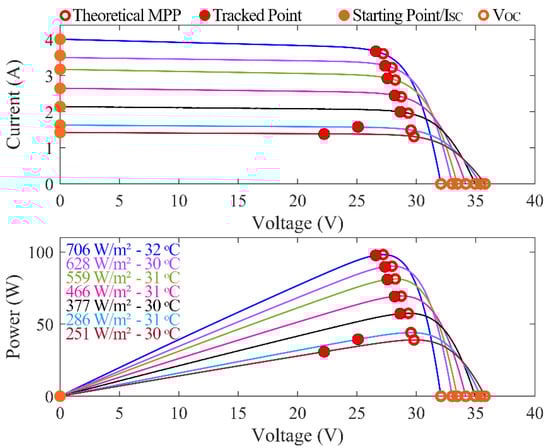 Experimental replication of the prior simulation results was challenging to conduct because the maximum load value for any given set of environmental conditions should be determined. Since the irradiance and temperature are continually fluctuating, this is nearly impossible to ascertain. Furthermore, the maximum load is frequently very low, ranging from 10 Ω to 55 Ω, and the load bank is incapable of producing such a required load. Thus, the POVC was operated as a normal P&O MPPT algorithm in the experimental test. This was achieved by setting the Vref to a very high value to force the POVC to track the maximum possible Vref value during any environmental condition. Therefore, output voltage regulation was not considered in these tests. P–V and I–V curves were used to illustrate the obtained MPPT experimental results, as shown in Figure 12. As can be seen, except at the two lowest irradiances, the POVR successfully brought the PV operating point very close to the actual MPP. It is also worth noting that the POVR’s tracking zone extended from 0 V to VMPP. This fact strongly relates to the theory presented in Section 3.