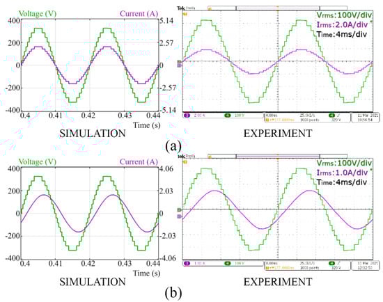 Figure 14. Output voltage and current waveforms obtained from simulation and experiment at the load of (a) R = 156 Ω, (b) RL = 168 Ω, 0.33 H.