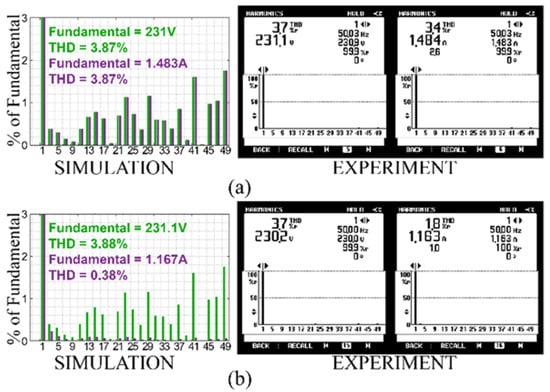 Figure 15. FFT analysis of voltage and current waveforms from simulation and experiment at the load of (a) R = 156 Ω, (b) RL = 168 Ω, 0.33 H.