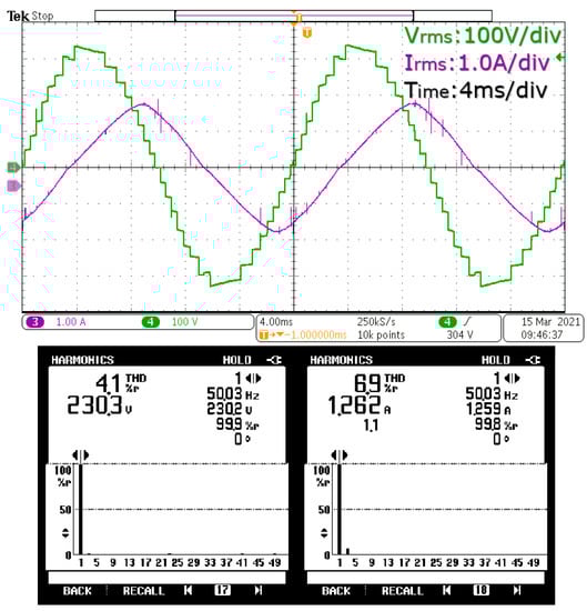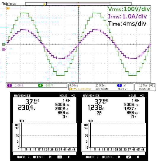In the last part of the experiment, the system was tested using real loads. The purpose was to verify the viability of the proposed system in real applications. Firstly, the output of the MLI was connected to incandescent light bulbs rated at 300 W. The output waveforms for both voltage and current are shown in Figure 17 with their respective FFT analysis. The behaviour of the incandescent bulb load was found to be very similar to that of the pure R load. This is because the incandescent bulb is nearly entirely resistive due to the absence of external inductive or capacitive elements. There is still some reactance due to the construction of the bulb and its filament, but they are very insignificant. Thus, the voltage and current waveforms still produced comparable THD values.