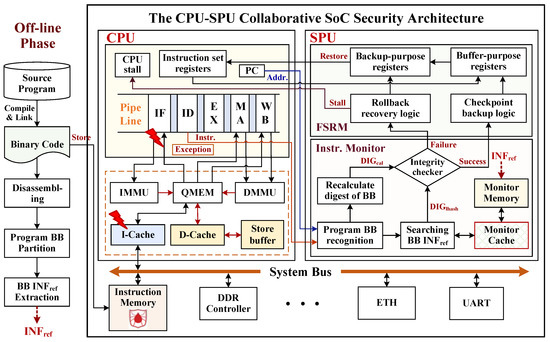 Embedded systems applied in safety-critical equipment require a high quality of security to guarantee program execution security, especially for remote-controlled hardware platforms. This paper presents a CPU–SPU collaborative SoC that integrates the proposed SPU to monitor the program execution and instruction fault recovery in real time. The hardware-implemented SPU architecture employs an instruction monitor to verify the BB integrity signature for detecting malicious instruction tampering behaviors caused by hardware Trojans and artificial modification.
