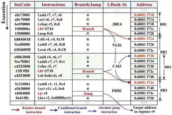 As shown in Figure 2, the LHash algorithm was utilized to calculate the instruction information and generate the 16-bit integrity signatures for BB1 to BB4, respectively. Furthermore, an important consideration of applying the LHash algorithm is utilizing its sequential iteration mechanism in the sponge structure to recalculate the integrity signature of a sequence of instructions during program execution, which is then compared with the value of the previously-stored LHash-16 integrity digest in the table. Consequently, this algorithm will quickly complete the integrity signature calculation under a low hardware complexity.