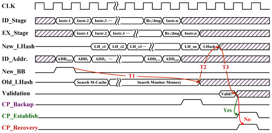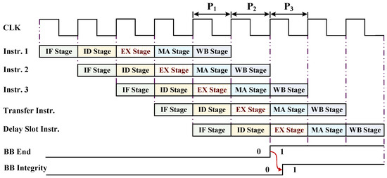 Then, in the P2 clock cycle, the instruction (Instr. 3) execution stage has completed, its operation results are stored into the instruction set registers, and the temporary registers associated with it will no longer affect the execution of subsequent instructions. The jump instruction enters the EX stage, and some relevant registers will be updated. Finally, in the P3 clock cycle, the instruction monitor will detect a delay slot instruction, which indicates the end of the current BB, and if the relevant registers for the jump instruction execution have completed updates, the integrity signature of the current BB will be verified as early as at this time.