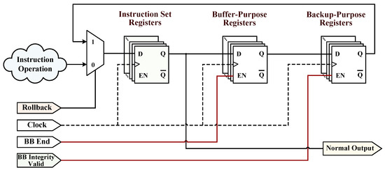 In order to avoid this wrong situation, we configured the two-stage registers of buffer-purpose and backup-purpose registers for the checkpoint-rollback operation. The schematic implementation of two-stage registers for the checkpoint rollback operation is shown in Figure 4. When the processor executing instructions and each BB’s integrity signature check are successful, the CPU checkpoint-rollback operation are not activated, and the instruction set registers are updated according to the current instruction execution.