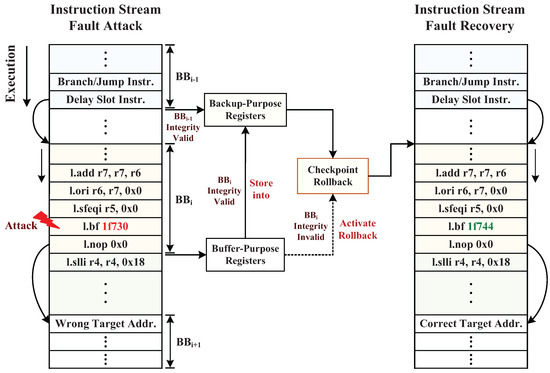 On the other hand, if the integrity is invalid, we assumed the branch transfer instruction l.bf 1f744 was tampered with by an attack to a wrong target branch address of l.bf 1f730, the values of buffer-purpose registers will be overwritten in the next BB execution. Finally, the checkpoint rollback is activated, and the values of backup-purpose registers are restored into CPU instruction set registers, and the CPU re-fetches the instruction order from the instruction memory for re-execution.