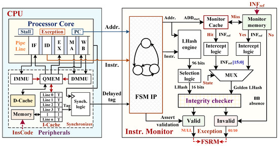 In another path, an additional monitor cache (M-Cache) is configured to buffer parts of blocks from the monitor memory. The instruction monitor searches the cache lines of M-Cache according to the received of each BB. If the M-Cache hits, the corresponding block is input an intercept logic for obtaining the 16-bit BB integrity digest of as the golden LHash (); if M-Cache misses, the instruction monitor starts to search the in the monitor memory. If it succeeds, a two-input multiplexer (MUX) controlled by the states of hit/miss receives the [15:0] after the intercept logic; if it fails to search, the monitor asserts an invalid signal of BB absence to the processor.