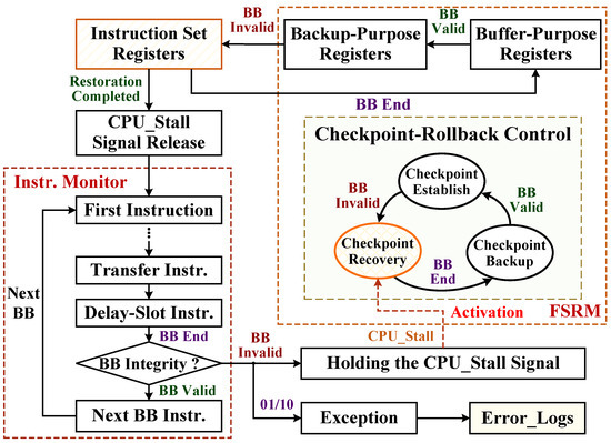 As previously described, the instruction fault self-repairing operation of the FSRM via the checkpoint-rollback mechanism is tightly coupled with the BB integrity checking mechanism of the instruction monitor. The overall control status diagram of the SPU real-time instruction monitoring and checkpoint-rollback operation is illustrated in Figure 7. When the instruction monitor detects a delay-slot instruction following transfer instruction into the execution of the CPU five-stage pipeline, the status of BB end triggers the checkpoint-backup operation, which duplicates the values of instruction set registers into buffer-purpose registers.